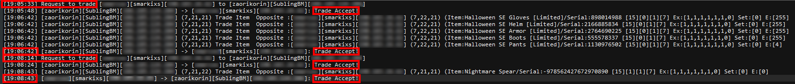 PASA Q AYER DIA 29/10/2018 A LAS 6:30PM EN EL MAPA ATLANS.. ESTABA TRADEANDO CN UN PJ LLAMADO smarkis el me pidio q le mostrara mis items , cuyos items son: SET HALLOWEEN BONUS NORMAL Y 2 NIGTHMARE SPEAR SD BYPASS Y mi pj se llama SublingBM Y mi ID es zaorikorin...