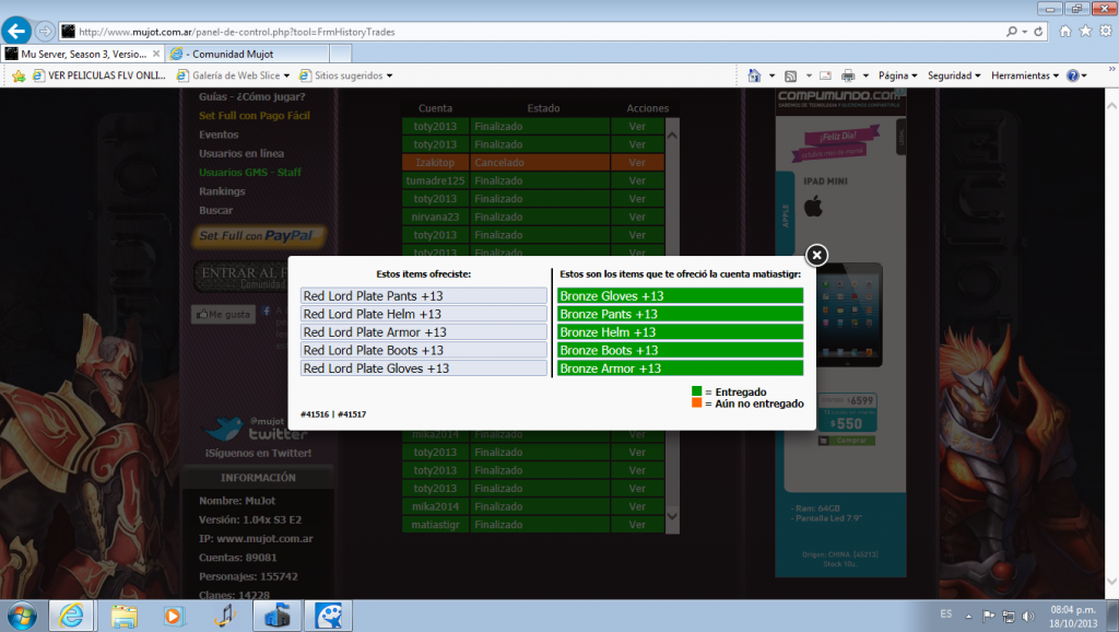 CeroCooll2014 escribiste:hola. Les cuento que en el dia de hoy aprox.... a las 17:00 hs, realice un trade online con (PJ: Soretes), habíamos acordado el intercambia de un set; por mi parte enviaba un set Red Lord Full DMG 7% y el otro pj ofrecia un set Bronce full DMG 7%... Yo envie según lo acordado pero el no, a mi me llego un set bronce full, pero con 5 refines distintos, después de esto busque al personaje varias horas pero nunca respondio, quiero pedir si se puede hacer que me devuelva mi set o si no que envie los ítems acordados.... Desde ya muchas Gracias!!!!